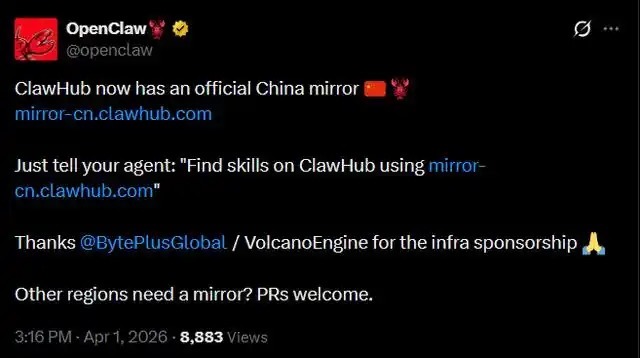 ClawHub 推出官方中国镜像站,显著提升国内 AI Agent 开发者访问技能库的速度与稳定性,同时推动 AI Agent 生态的本土化发展。